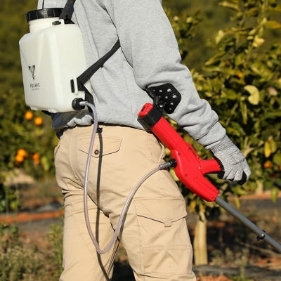 The Pulmic Fenix 35 hydraulic sprayer is a professional device for the precise application of systemic herbicides such as Monsanto and Roundup. Equipped with a 35 cm protective hood to minimize chemical drift, it's ideal for spraying low-growing plants, young trees, and shrubs. Powered by a lithium battery that provides up to 8 hours of continuous operation, the standard green nozzle allows for a spray rate of up to 25 liters per hectare. It features a labyrinth shield that protects the engine from moisture, and an ergonomic handle with an armrest for increased comfort during extended use. Lightweight and easy to use, it's perfect for farmers and gardeners.